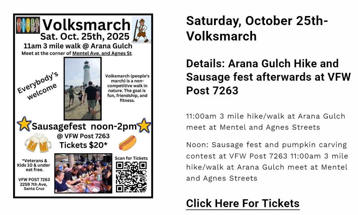 Details: Veteran’s Day Walk. Meet at 8:30am at Natural Bridges State Beach Corner of Swanton Blvd. and West Cliff Dr. Finish at 1pm Britannia Arms 110 Monterey Ave. Capitola. Rain or Shine.